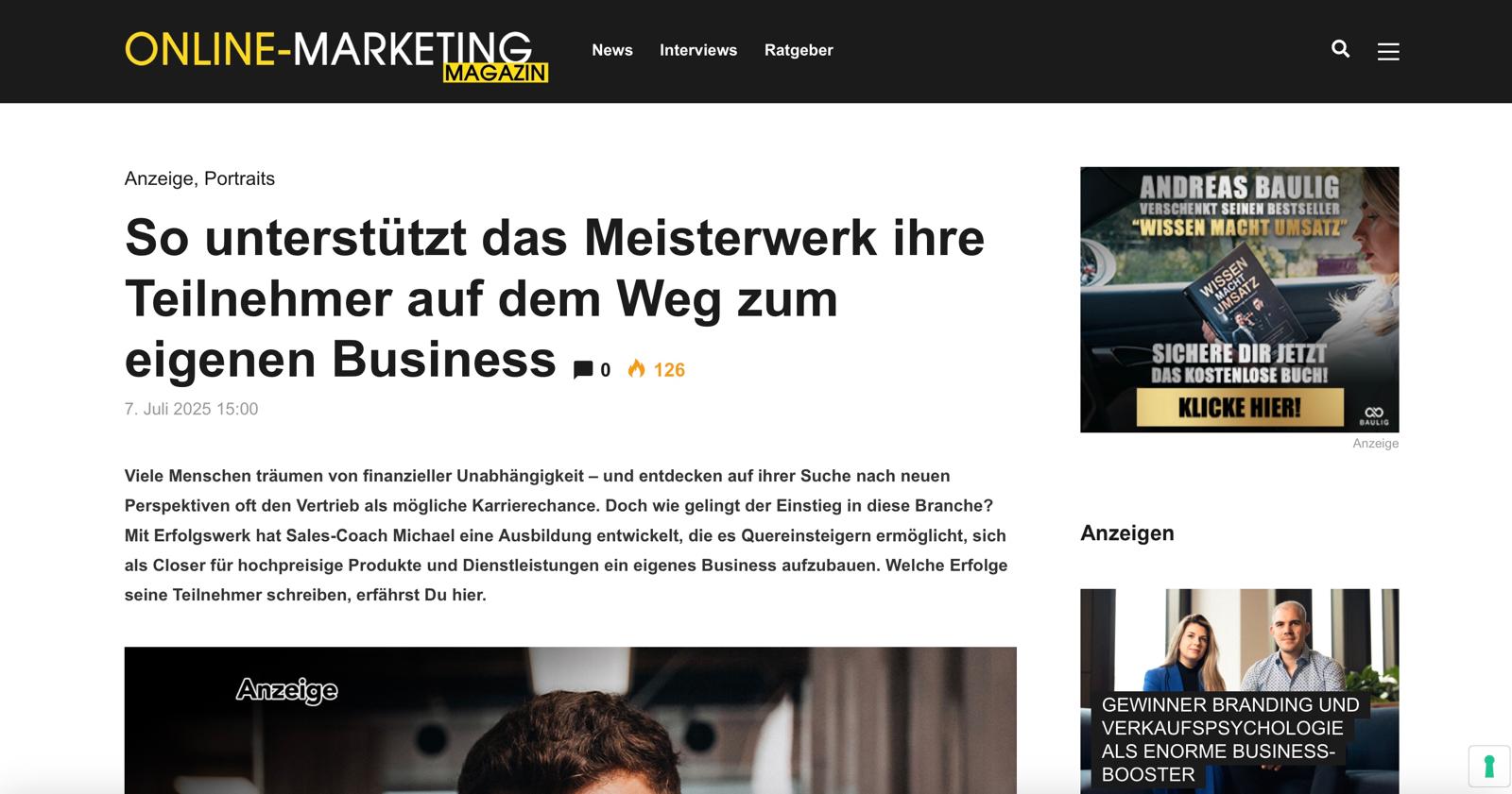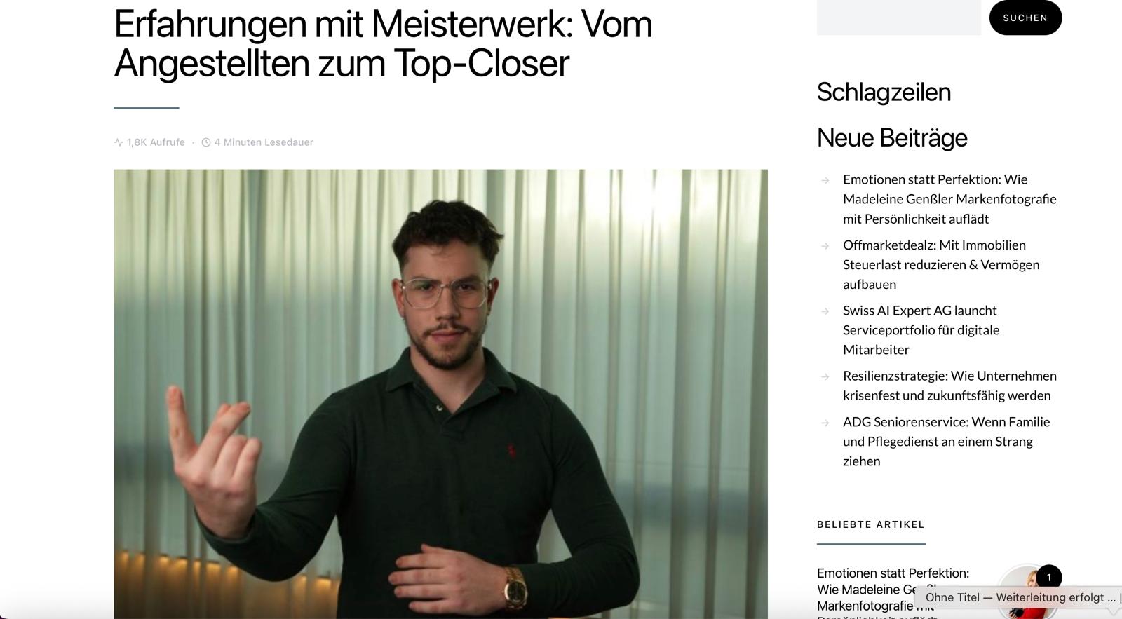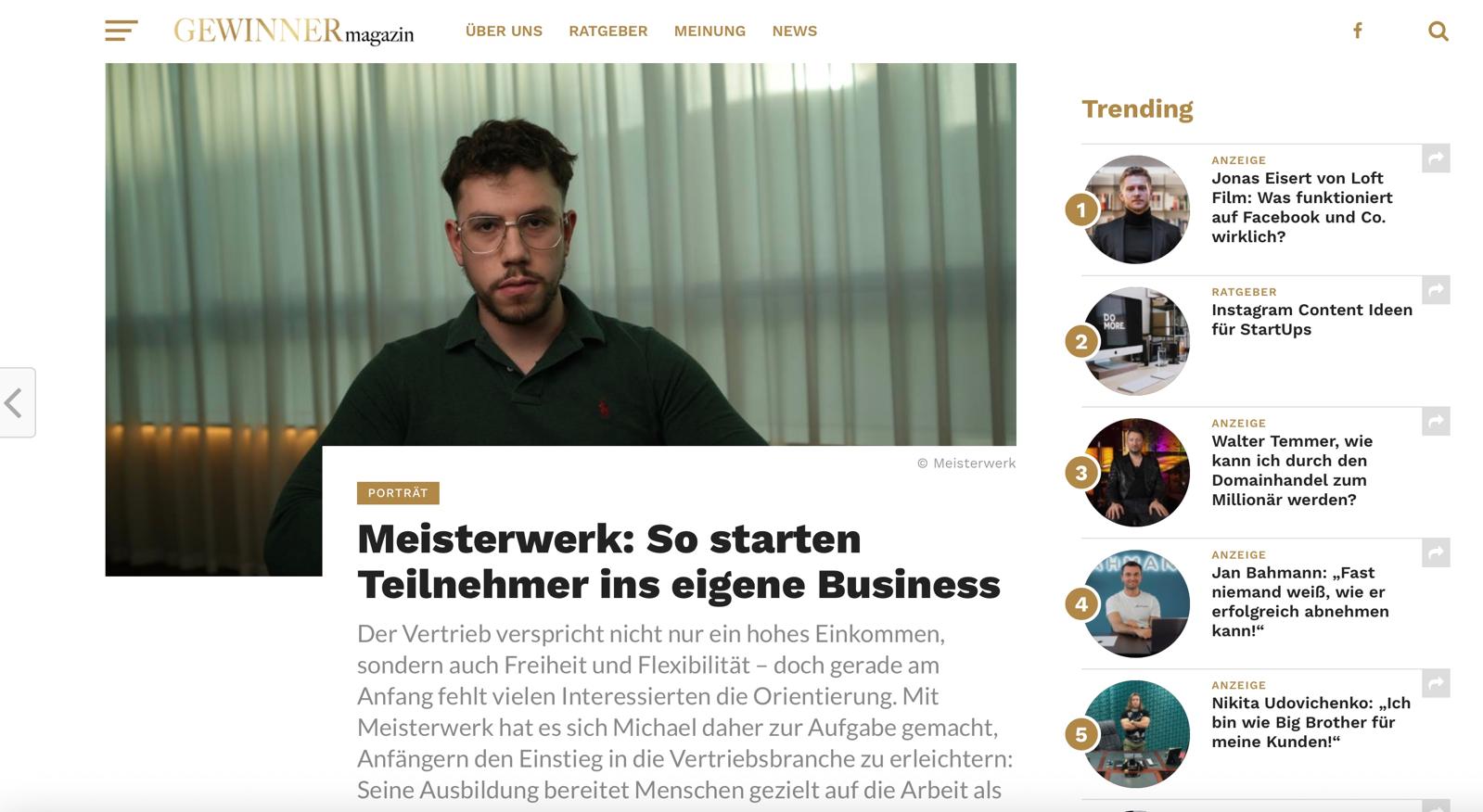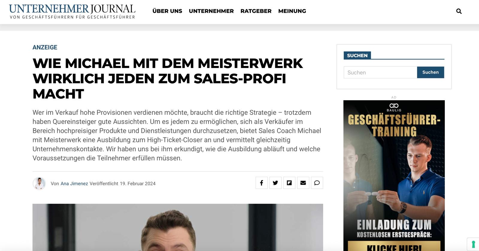 Michael ist Sales-Experte und Gründer von Meisterwerk. Mehr als 1.000 Menschen hat er bereits erfolgreich dabei unterstützt, im Sales-Bereich durchzustarten. In seiner Masterclass verbindet er bewährte Verkaufstechniken mit praxisnaher Umsetzung. Seine Methoden wurden in Medien wie Forbes, Welt und weiteren renommierten Publikationen vorgestellt.